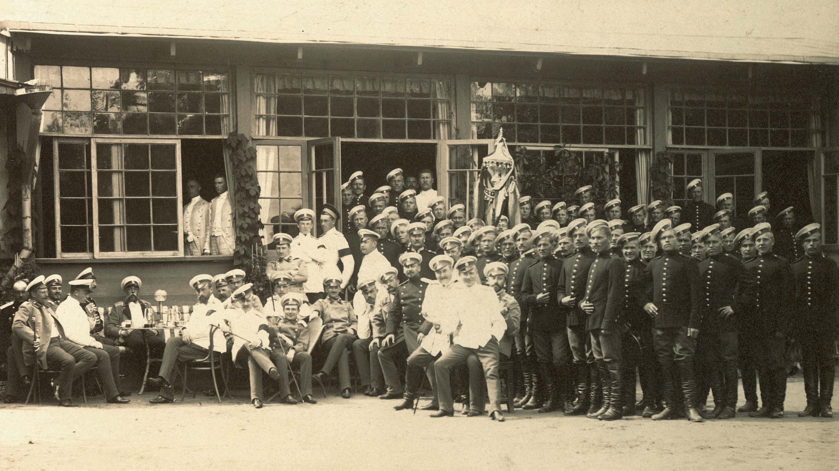 Upseereita ja sotilaita kokoontuneina sohvalla istuvan rykmentin komentajan N. A. Timiriazeffin ympärille yhteiskuvaan Krasnoje Selossa 1891. (Kuvalähde: Mannerheim-museo)