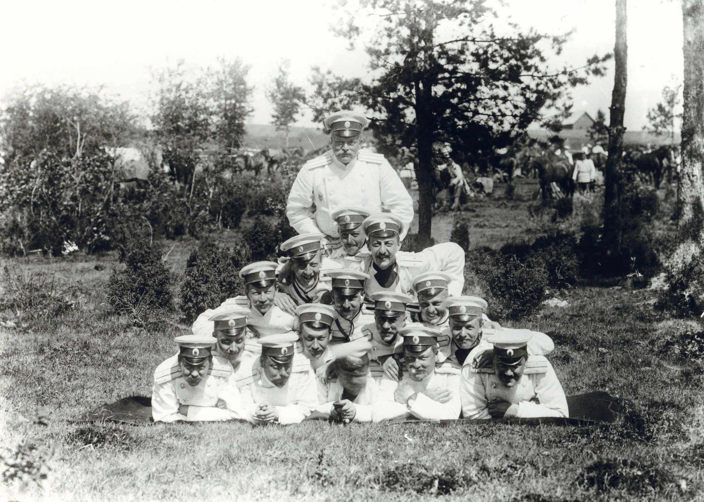 Juhlaparaatin jälkeen on hetki aikaa hauskanpitoon ystävien kanssa – pojat ovat aina poikia. Upseeripyramidi Krasnoje Selossa. (Kuvalähde: (Kuvalähde: Chevalierkaartin perhe)