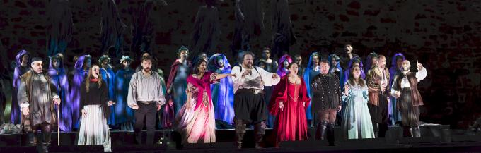 Ravenna Festivalin oopperat ohjaa festivaalin taiteellinen johtaja Cristina Mazzavillani Muti ja johtaa kapellimestari Nicola Paszkowski. Falstaffin roolissa ilakoi Kiril Manolov. Macbethin nimiroolin laulaa Vladislav Sulimsky, Lady Macbethinä on Vittoria Yeo ja Banquona Daniel Giulianini.