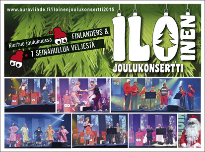 – Joulun 2015 Iloinen Joulukonsertti pitää sisällään jo totuttuun tapaan käsikirjoituksen, “Sisko ja sen veli” ja “Tankki täyteen”, Jussi Tuomiselta sekä Tiina Brännaren ohjauksen ja koreografian. Juontajuudesta vastaavat Finkkujen Jussi Lammela ja juontaja-soittaja-laulaja-näyttelijänä toimii myös Kari “Kunu” Lehtomäki sekä Seinähullujen Seppo Korjus ja Raimo Smedberg, kertoo Finlandersin Aarne Hartelin.