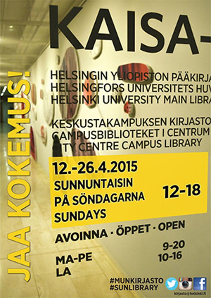 Helsingin yliopisto kerää huhtikuussa kokemuksia kirjaston sunnuntaiaukiolosta. Kevät on kiireistä aikaa opiskelijoille ja juuri tämän vuoksi kokeilu sijoitettiin kevätkauteen, jolloin lukupaikoista on huutava pula. Kaisa-talossa sijaitseva pääkirjasto on avoinna kolmena sunnuntaina ja kävijöiltä kerätään mielipiteitä aiheesta.