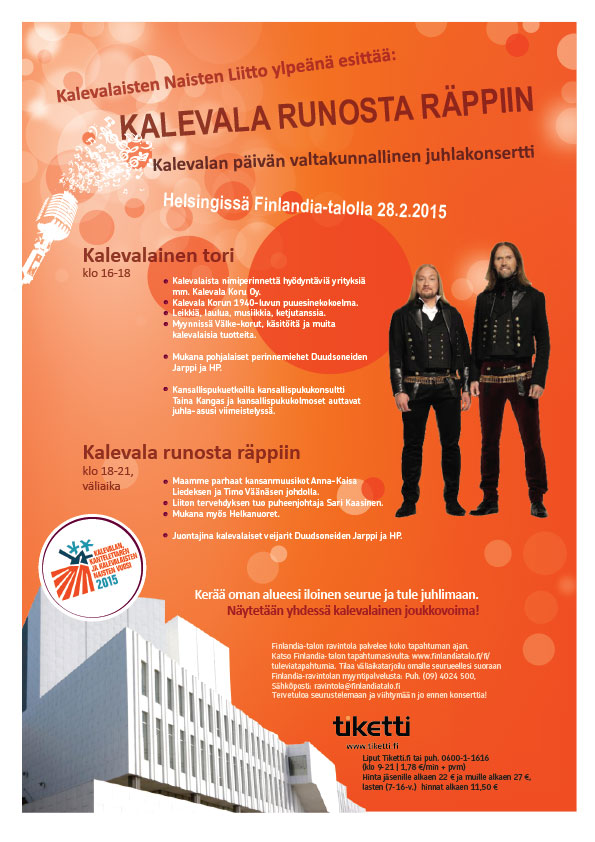 Duudsonit esiintyvät Kalevalaisten Naisten juhlakonsertissa Kalevalan päivänä lauantaina 28.2.2014 Finlandia-talolla. Liput ovat myynnissä Tiketissä.