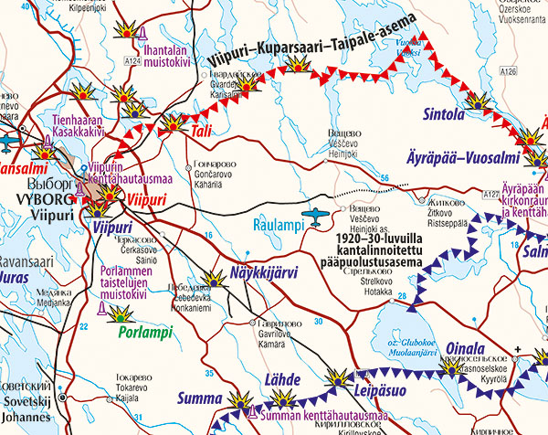Toisen maailmansodan sotatapahtumat Karjalassa on koottu yhdelle kartalle, jolta saa helposti yleiskuvan talvisodan, jatkosodan ja Lapin sodan taistelujen sijainneista. Koska pohjalla on nykytilannetta kuvaava kartta, uutuutta voidaan käyttää oppaana sotahistoriallisilla matkoilla Karjalaan.