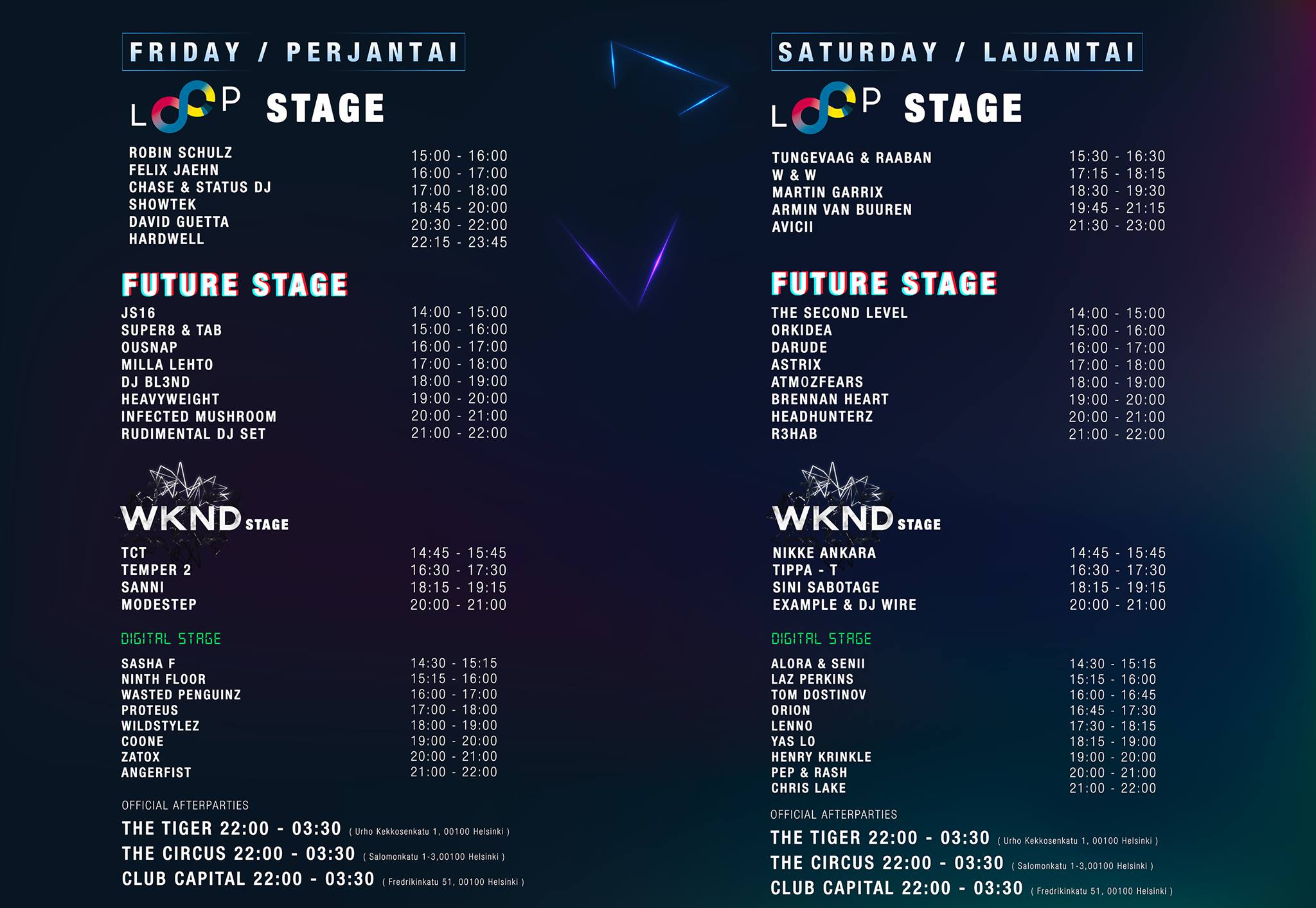 Nyt jo kolmatta kertaa Helsingissä järjestettävä Weekend Festival valittiin viime vuonna Yleisradion äänestyksessä maamme parhaaksi musiikkifestivaaliksi. Lisäksi Weekend Festival on valittu koko Euroopan elektronisen musiikin festivaalien viiden parhaan kärkijoukkoon. Weekend Festivalissa esiintyy tänä kesänä ennätysmäärä maailmanluokan tähtiä, kuten David Guetta, Avicii, Hardwell, Armin van Buuren, Martin Garrix, Showtek, Rudimental sekä kymmenet muut kotimaiset ja ulkomaiset huippuartistit.