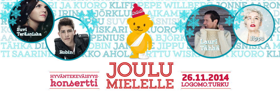 Lastenklinikoiden Kummien perinteikäs Joulu Mielelle -hyväntekeväisyyskonsertti järjestetään tänä vuonna kulttuurikeskus Logomossa Turussa. 26. marraskuuta paikalle saapuvan yleisön joulutunnelmaan virittävä konsertti nähdään MTV3:lla sunnuntai-iltana 14. joulukuuta. Lapsipotilaiden hyväksi lämminhenkisessä tapahtumassa esiintyvät Jonne Aaron, Pepe Willberg, Jippu, Lauri Tähkä, Suvi Teräsniska, Diandra, Irina Björklund, Jarkko Ahola, Martti Saarinen, Aikamiehet, Linda Lampenius, Robin, Jannike, Arttu Wiskari sekä Kliff. Janne Virtasen ja Heidi Sohlbergin juontaman konsertin musiikkiesityksiä tahdittaa Esa Niemisen orkesteri.