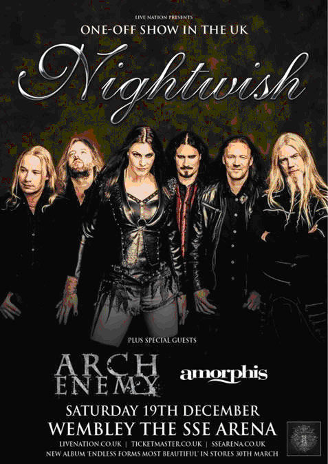 Nightwishiä saapuvat lämmittelemään ruotsalainen Arch Enemy sekä kotimainen Amorphis. Liput tulevat myyntiin perjantaina 13. helmikuuta täällä http://www.livenation.co.uk/artist/nightwish-tickets.