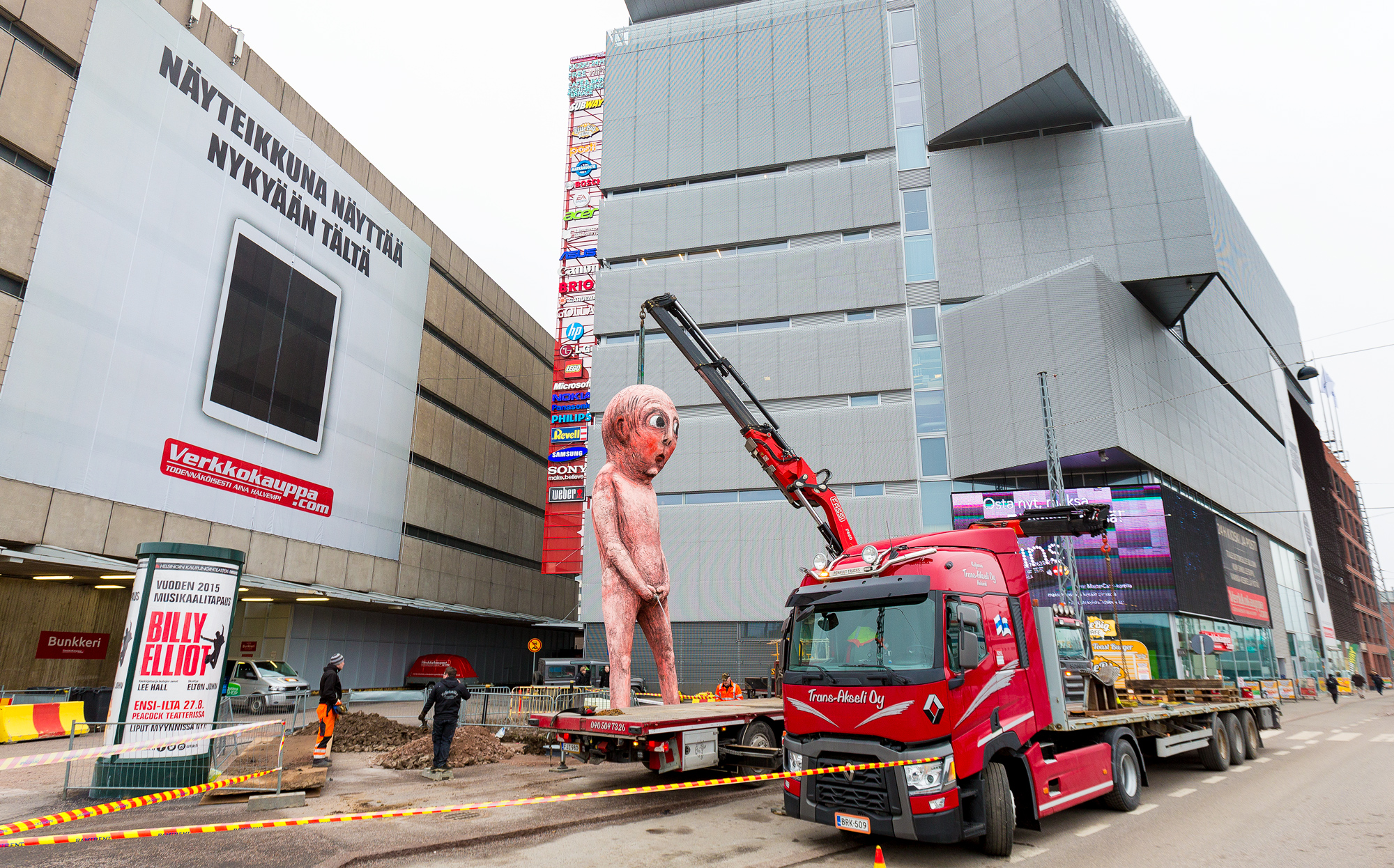 Ilkikurinen 8,5 metrinen Bad Bad Boy -veistos pystytetään tänään Verkkokauppa.com:n Jätkäsaaren megamyymälän eteen.