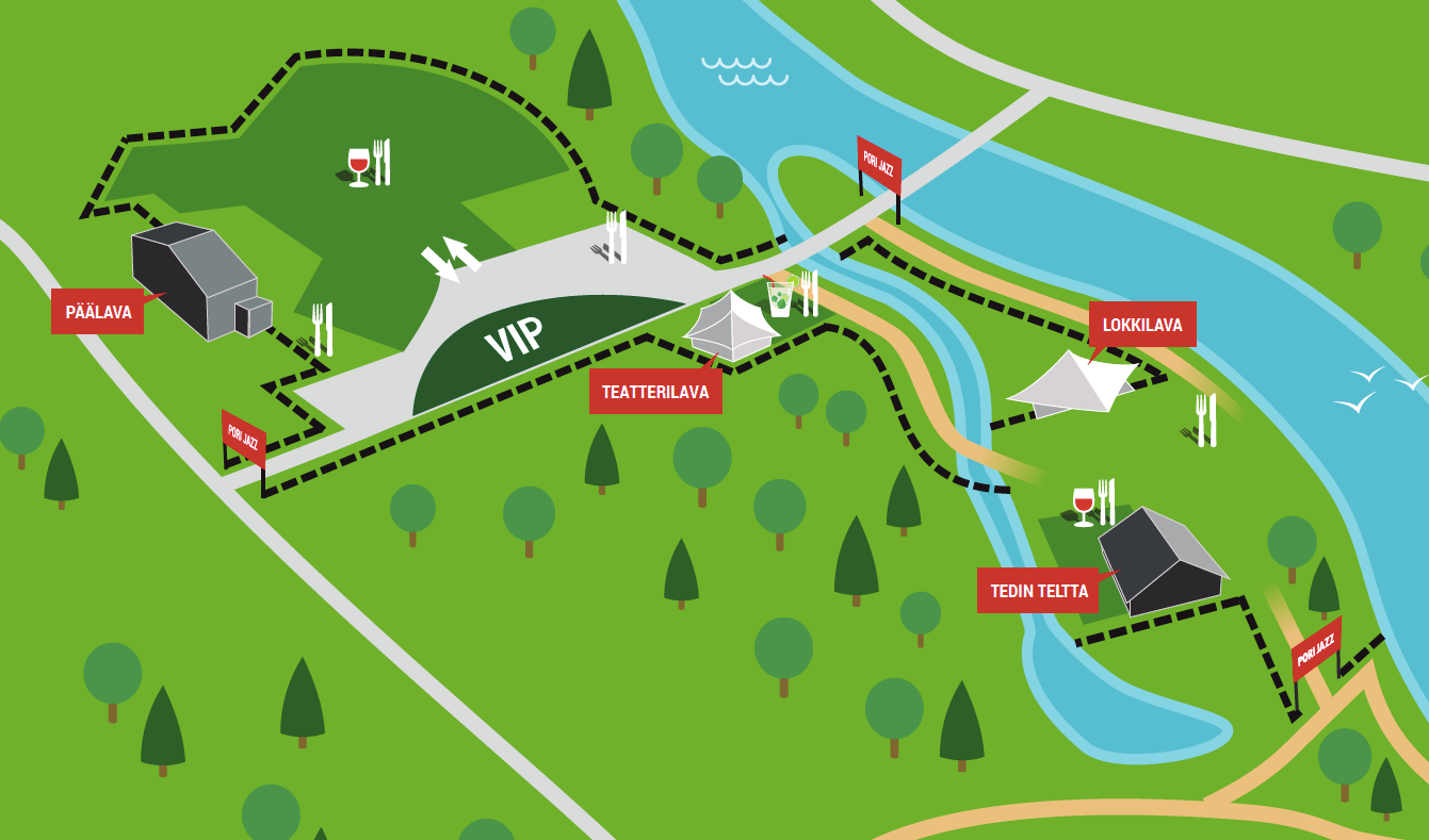 Kirjurinluodon ruokatarjontaan on luvassa parannuksia, joista tiedotetaan tarkemmin festivaalin lähestyessä. Festivaalialueen visuaalinen ilme sekä yleinen viihtyvyys on asetettu yhdeksi tulevien vuosien tärkeimmistä kehityskohteista. Tavoitteiden saavuttamiseksi Pori Jazzin aluevisualistina on tänä keväänä aloittanut työskentelynsä Tom Gustafsson, joka on viimeiset kymmenen vuotta vastannut Flow Festivalin konserttialueen ilmeestä.
