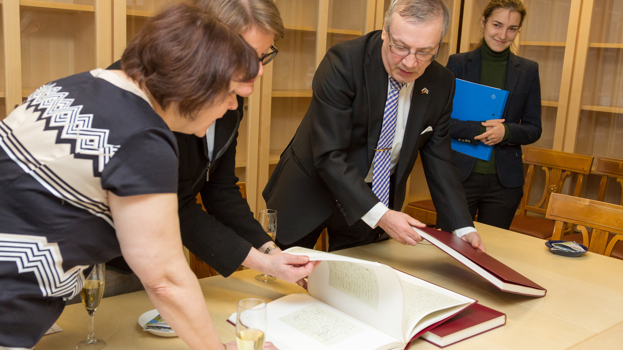 Kirjastonjohtaja Ulla Nygrén, vararehtori Riitta Pyykkö ja pääkonsuli Alexander B. Svertshkov eivät malttaneet olla selailematta harvainaislaatuisia Boldinon käsikirjoituksia. Kolmeen niteen teosta on painettu vain 500 kappaletta. Taustalla tulkki Margarita Kokeeva. Kuvaaja: Antti Tarponen