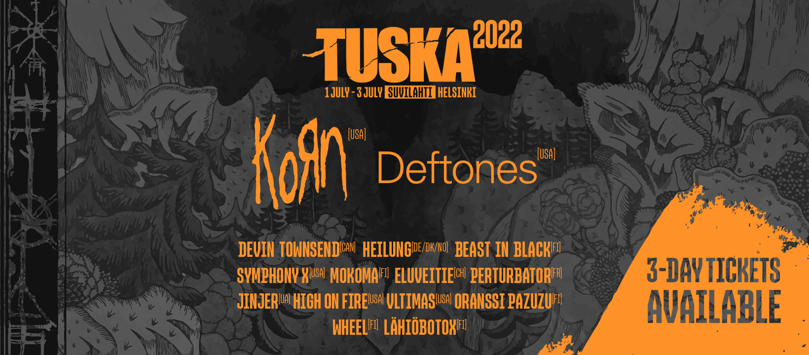 Tuskassa nähdään muun muassa Korn, Deftones, Devin Townsend, Heilung, Beast In Black, Symphony X, Mokoma, Eluveitie, Jinjer, Lähiöbotox ja monta muuta metalliairuetta. Tuska järjestetään Helsingin Suvilahdessa 1.–3.7.2022.