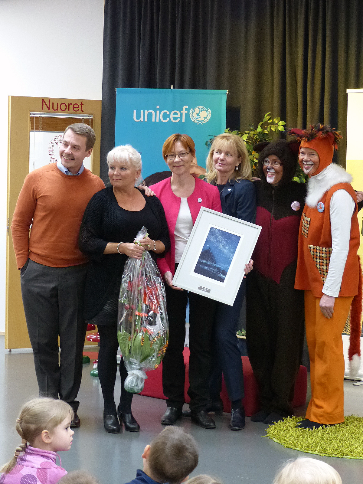 UNICEFin Lasten oikeuksien vaikuttaja 2014 -tunnustus myönnettiin Suomen kirjastoille 18.11.2014 Lahden kaupunginkirjastossa. Kuvassa lapsiasiavaltuutettu Tuomas Kurttila, kirjastotoimenjohtaja Marja Malminen, Yleisten kirjastojen neuvoston puheenjohtaja Rebekka Pilppula, Suomen UNICEFin ohjelmajohtaja Inka Hetemäki, Lahden kirjaston maskotit Malla Mesikämmen ja Kuoma Repolainen.